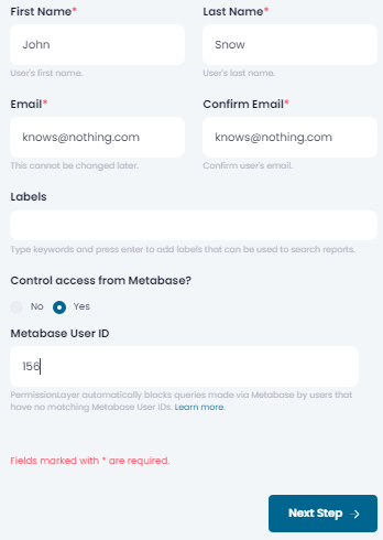 Now, back to PermissionLayer, you'll need to add your users with their Metabase User IDs. This will allow PermissionLayer to relate queries from Metabase with the permissions you set for these users.