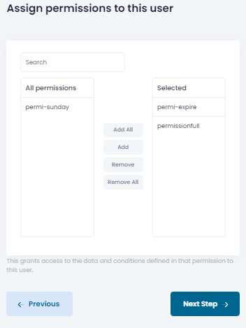 Next, assign as many permissions as you want for this user. You need to assign at least one permission to create a user. These permissions will define what data this user can access, besides other security options.